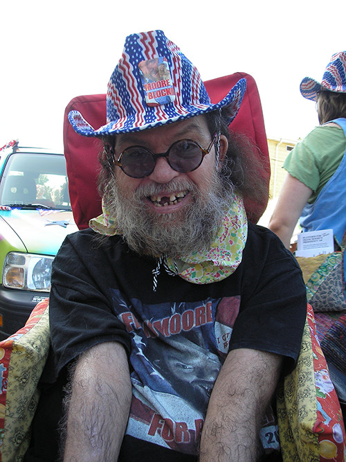 It really was only a brief respite, taking the FM4Prez vinyls off of the cars and getting unpacked, and heading over to our booth on the other side of the park, before the intensity of the parade continued at the booth. But first, there was Earlene in her Uncle Frankie tank, taking care of everything at the booth, enjoying herself, happy to see all of us, and really impressed with the whole Frank Moore for President get-up! Frank and Earlene took a great picture together, and soon she was on her way ... Corey set up the video camera, and the action began again ... Since the booth was placed right on the corner of a main entrance and exit part for people coming into the park, and since the booths were more tightly packed than the year before, people were right up on the booth all day!