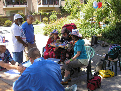 Before we knew it, the candidate had arrived, and you guys were rolling down into the square. David the notary had arrived at about 11:30, and came back at noon to set up his stuff. What a great guy. It was so neat how he was happy to stay, and seemed to really be listening to Frank, especially the speech, really taking it all in ... The conversation between Frank, Carl and Mike was really great! And the whole process of David notarizing all the electors and then notarizing Frank's forms for Indiana, Kansas, Maryland and Washington was really fun. A really fun day! And then to hear all the history of the Square from Carl, and their ideas about how to take care of the people needing assisted living, and the way that some have had to sell off all of their possessions to qualify for the public assisted living available in SF ... really fascinating. It was amazing to hear how the Square had started as a project of the Longshoreman's Union. Alexi said later that there was a plaque inside the office that basically said that the Square was established in 1963 to create a model of how people from different backgrounds, ethnicities and incomes could all live together in community where those things were not dividing people. It was really interesting to see how the choice to make the Square co-op a "fair market value" co-op as opposed to a "low-to-middle income co-op" set up the kinds of changes that have been occurring all over ... the value of all the units gets really high, excluding the very kinds of people who lived there originally, and who still need housing, and making it so only the wealthier can move in ... going against the original idea of the Longshoreman's ...